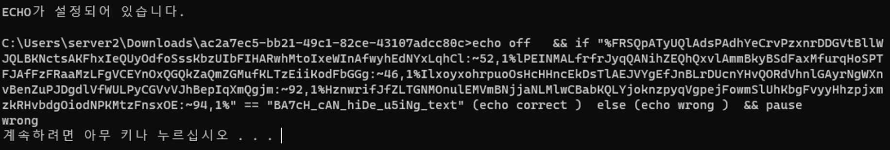 - 수정된 .bat 파일을 실행하면 flag값이 도출 됨을 확인하였다.
