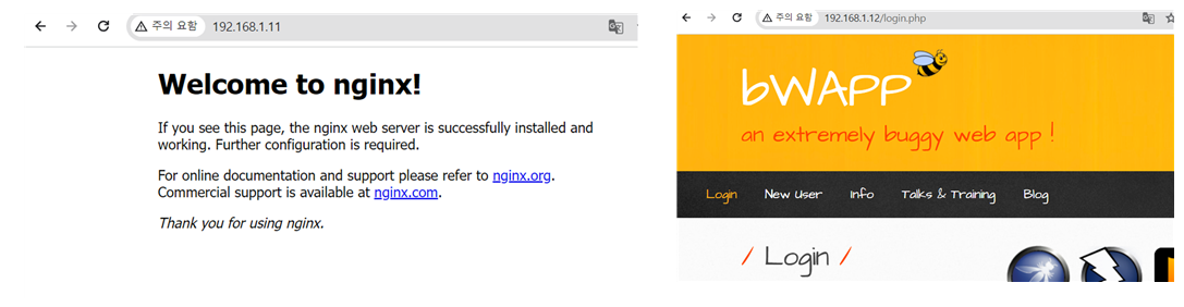 TYPE에 기존 NodePort가 아닌 "lb-nginx", "lb-bwapp"에 로드밸런서를 적용하여 디플로이먼트 파드들을 나눠 서비스를 배포합니다.