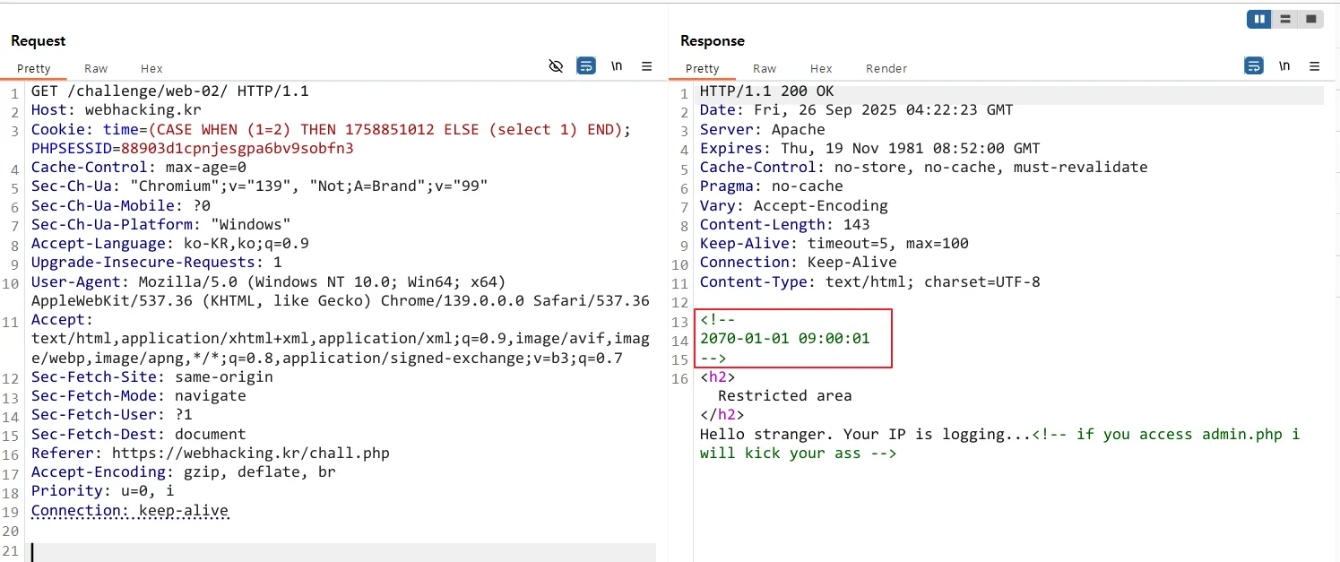 취약점 포인트를 확인하기 위해 특이한 부분을 먼저 인지를 해야한다. 특히 쿠키값에서 "time" 값이 존재한데 해당 값은 날짜를 정수형으로 보여주는 거 같다.