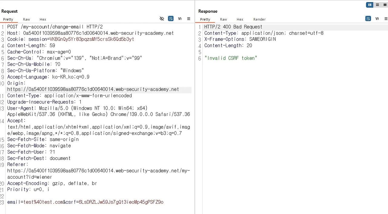 실습 사이트에서 계정 로그인 후 이메일을 변경 시 통신구간의 파라미터를 확인하면 변경할 이메일과 csrf 토큰값이 존재하지만 csrf 토큰값을 지우고 파라미터를 처리해도 정상적으로 이메일이 변경됨.