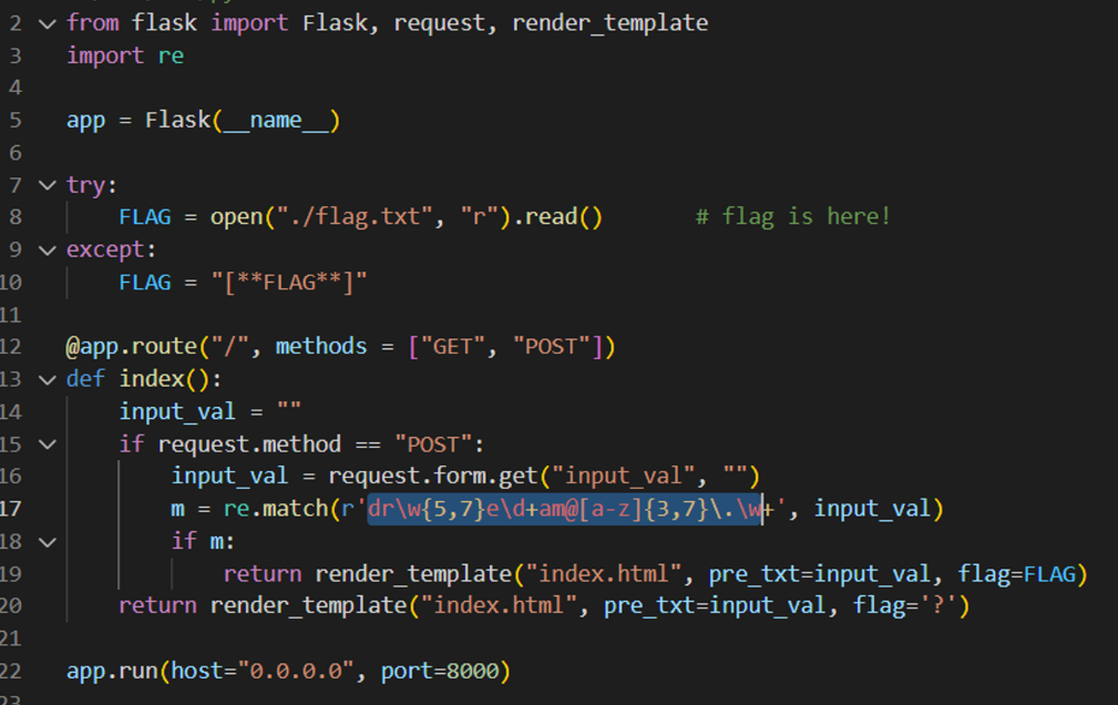 문제 파일을 확인 해 볼때 "dr\w{5,7}e\d+am@[a-z]{3,7}\.\w+" 정규화로 표현하여 입력하면 flag값을 준다는 내용이다.